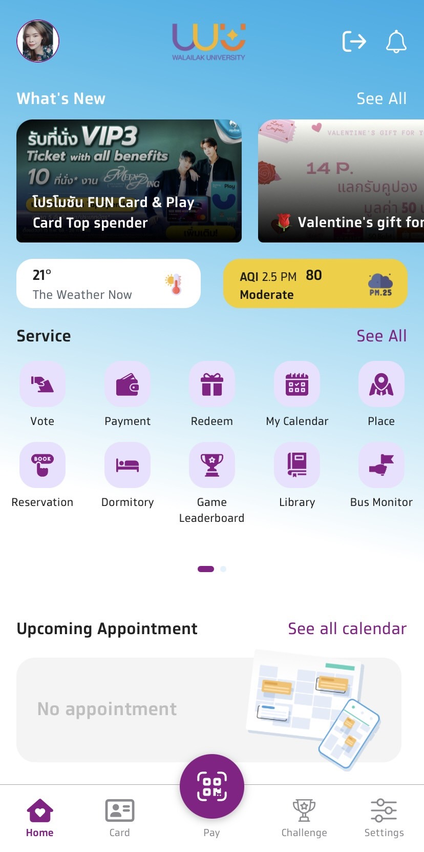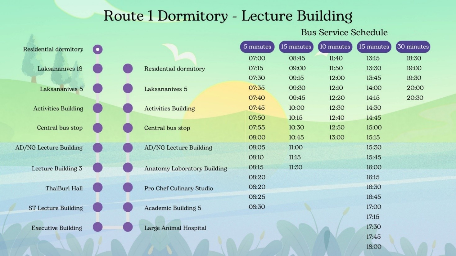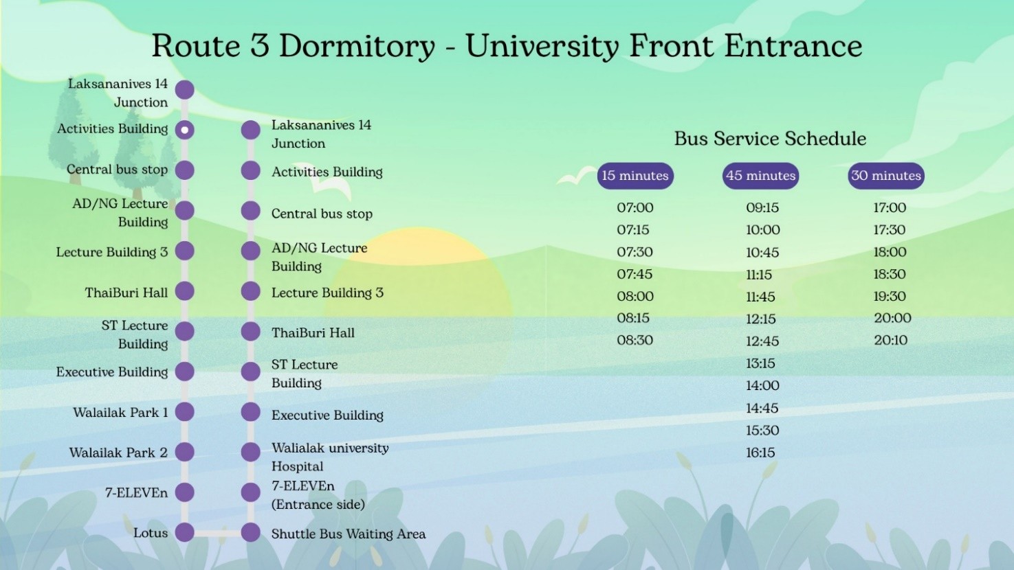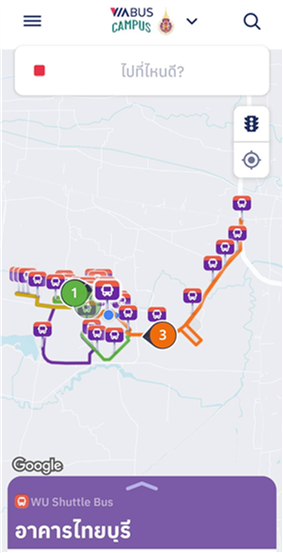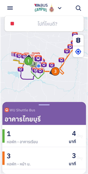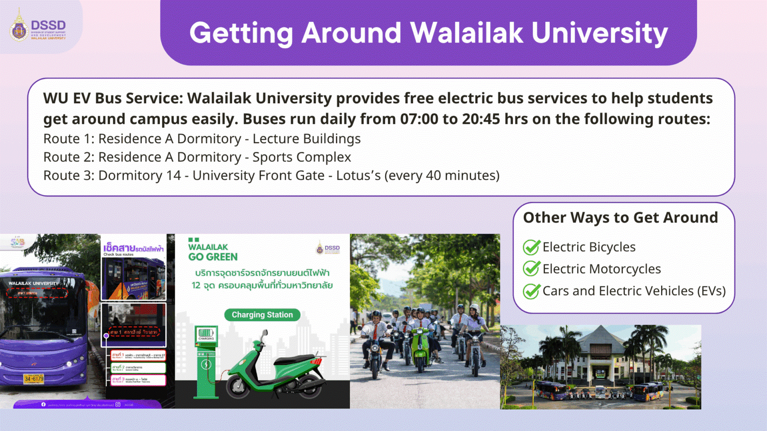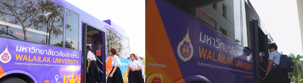 Walailak University provides a sustainable campus transportation system through the operation of nine electric shuttle buses, which are offered free of charge on a regular schedule. The service covers both on-campus routes and surrounding areas, connecting major destinations such as educational and academic buildings, student and staff residential zones, sports complexes, Walailak University Medical Center Hospital, the central library, the university park, and nearby shopping centers. The shuttle service is available daily from 07:00 to 21:00 hrs. The system has been designed to ensure accessibility and inclusiveness for all users. Each bus is equipped with free Wi-Fi and integrated with real-time vehicle tracking systems accessible via the WU APP and Via Bus applications, enabling users to conveniently monitor bus locations and service schedules. Moreover, the service is fully accessible to persons with disabilities and individuals requiring special assistance.