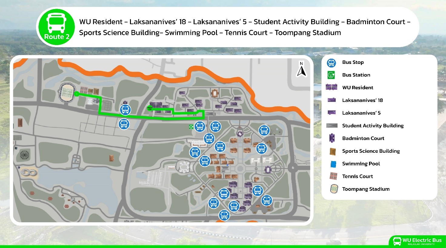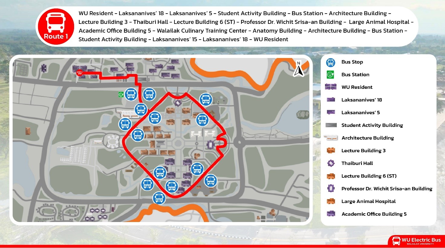 - Electric Shuttle Bus Service: Walailak University operates a public electric shuttle bus service to minimize the use of private vehicles among staff. The service includes nine electric shuttle buses operating daily from 07:00 to 21:00, covering all major areas of the campus such as academic buildings, student and staff dormitories, the sports complex, and the Walailak University Medical Center Hospital.