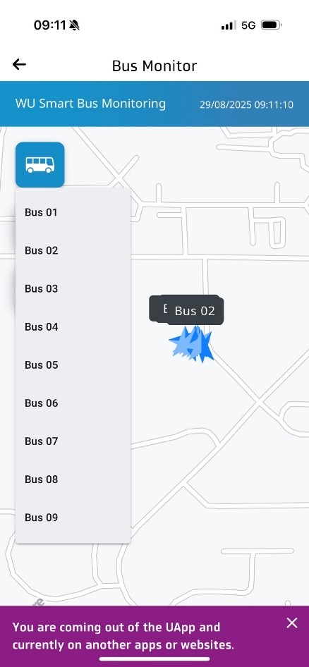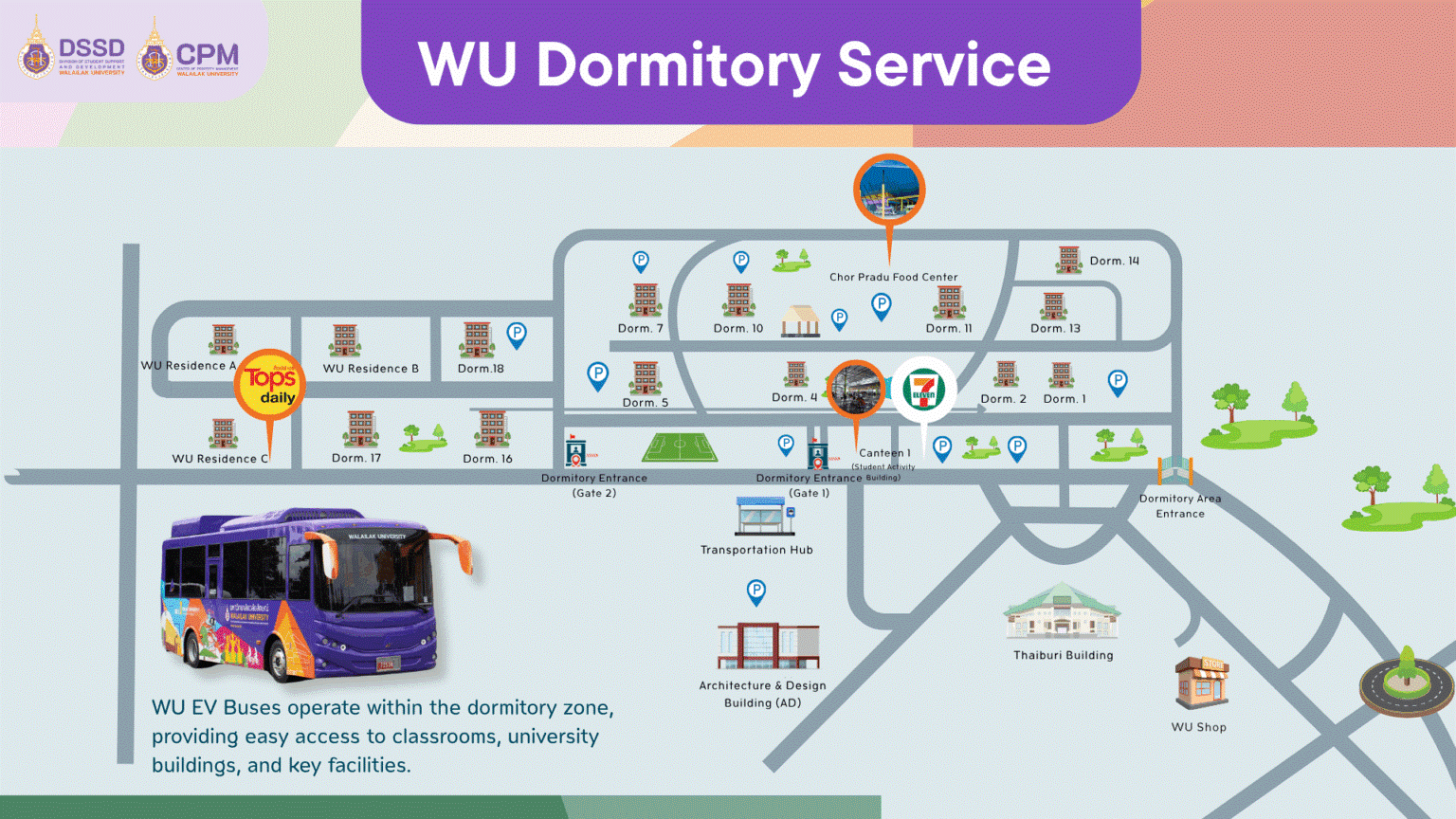 WU EV buses operate within the dormitory zone, providing easy access to classrooms, university buildings, and key facilities.
