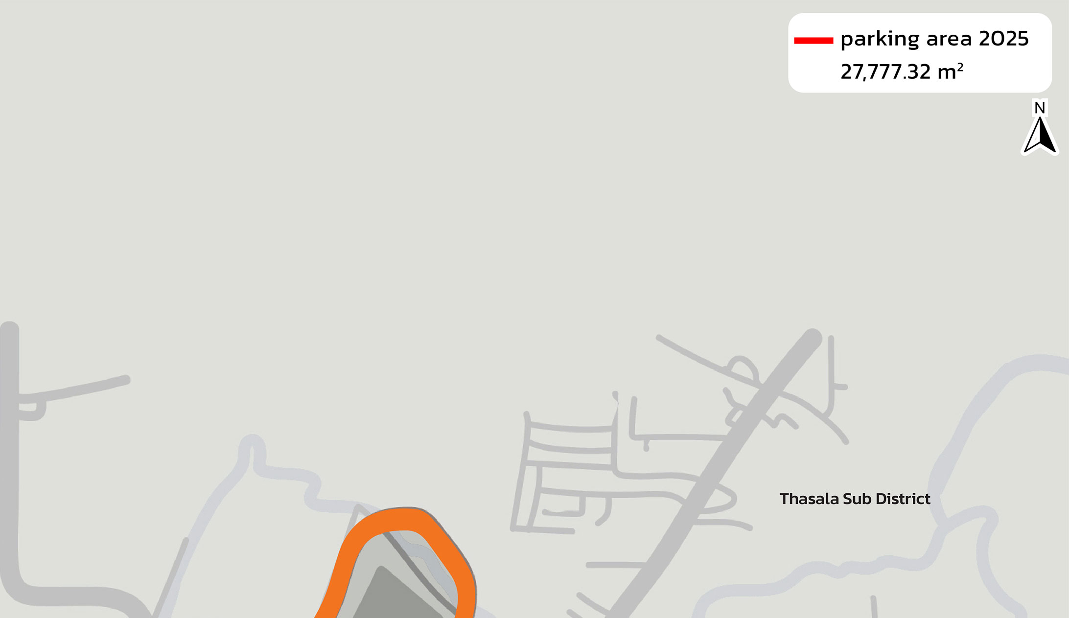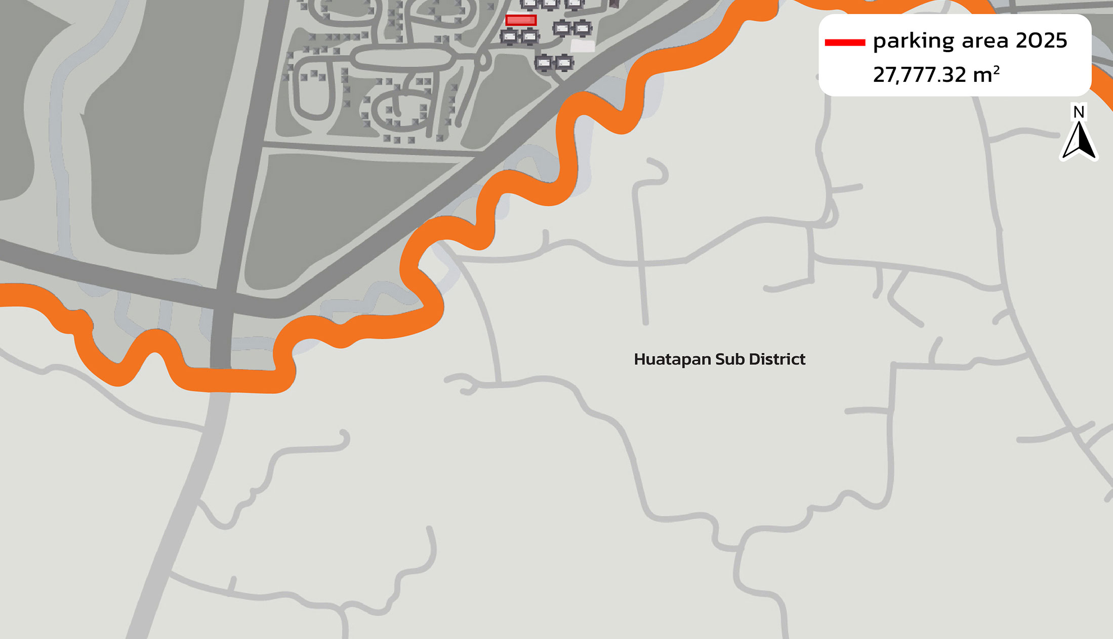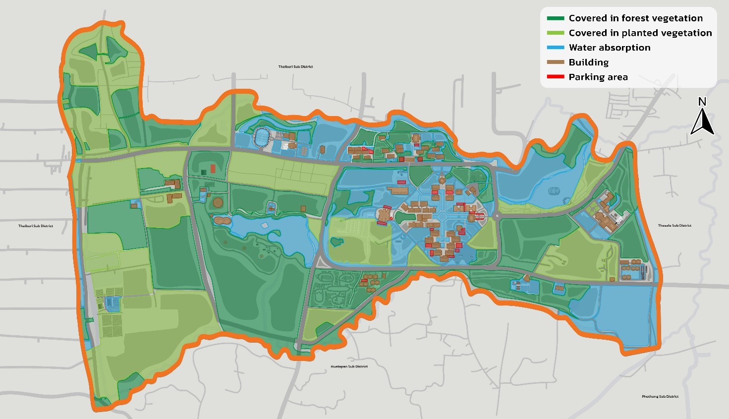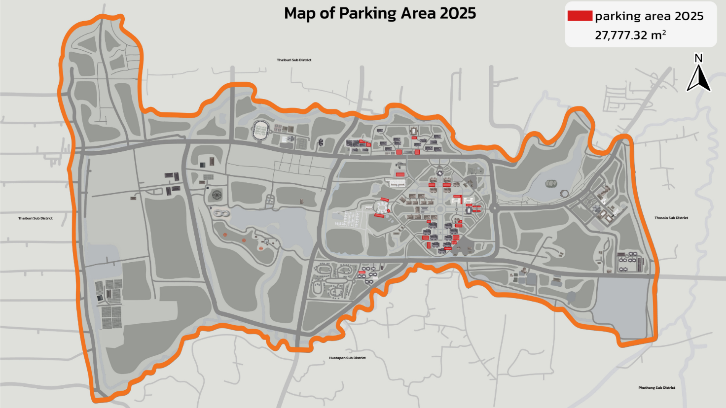 Walailak University covers a total area of 15,350,400 square meters, with designated parking areas amounting to 27,777.32 square meters.