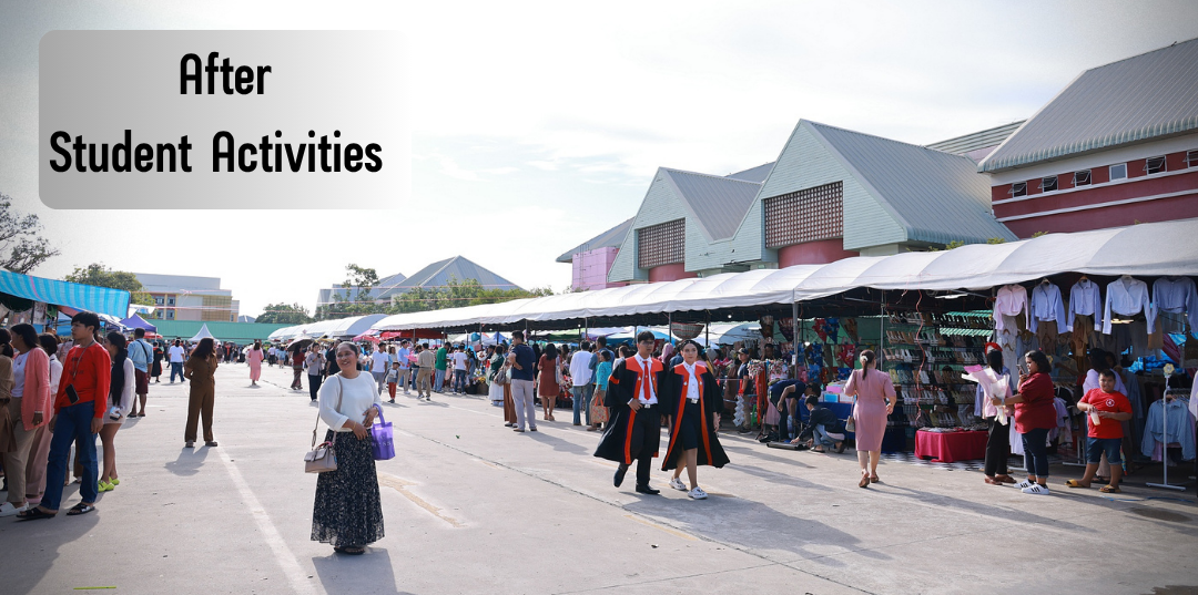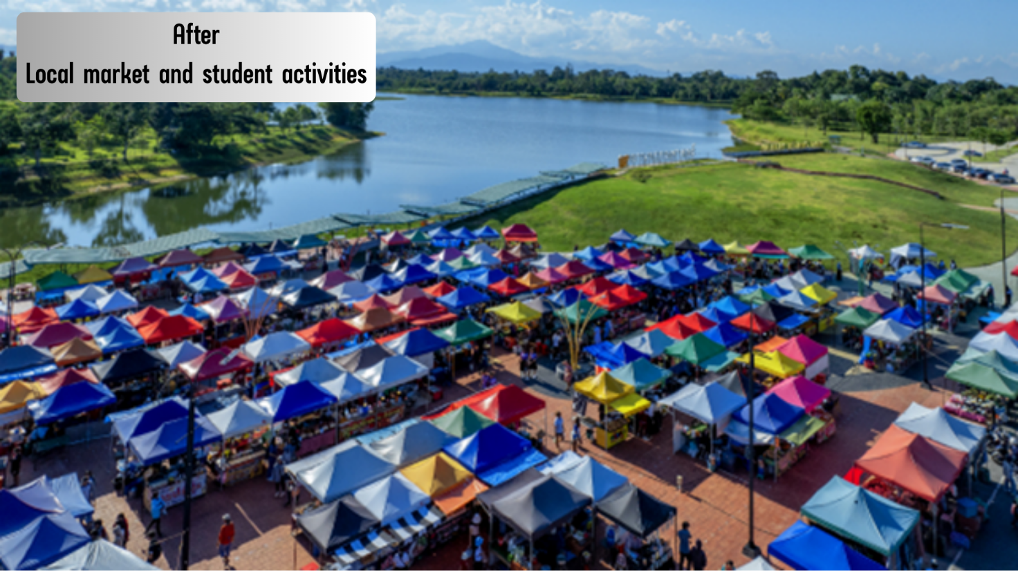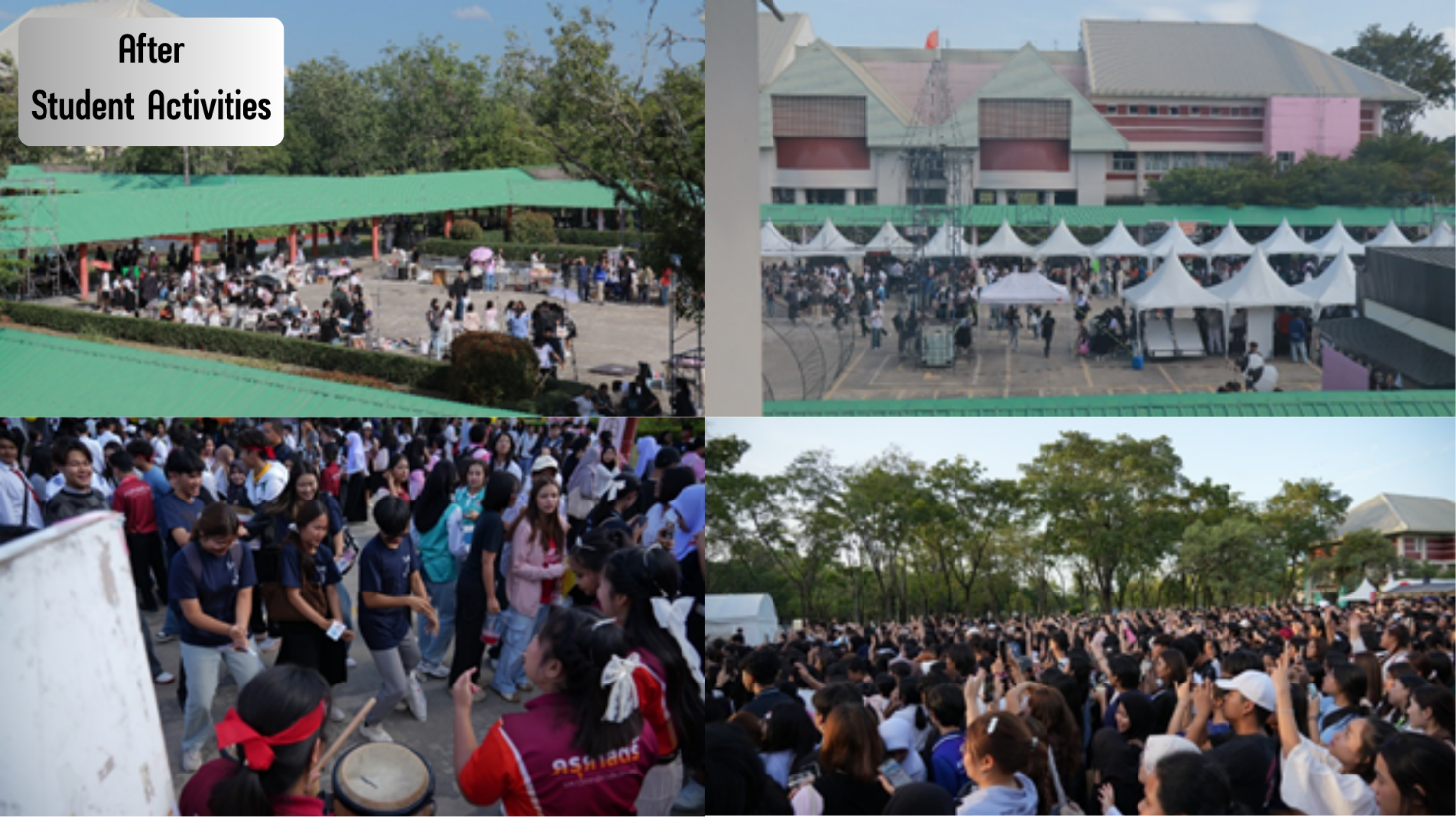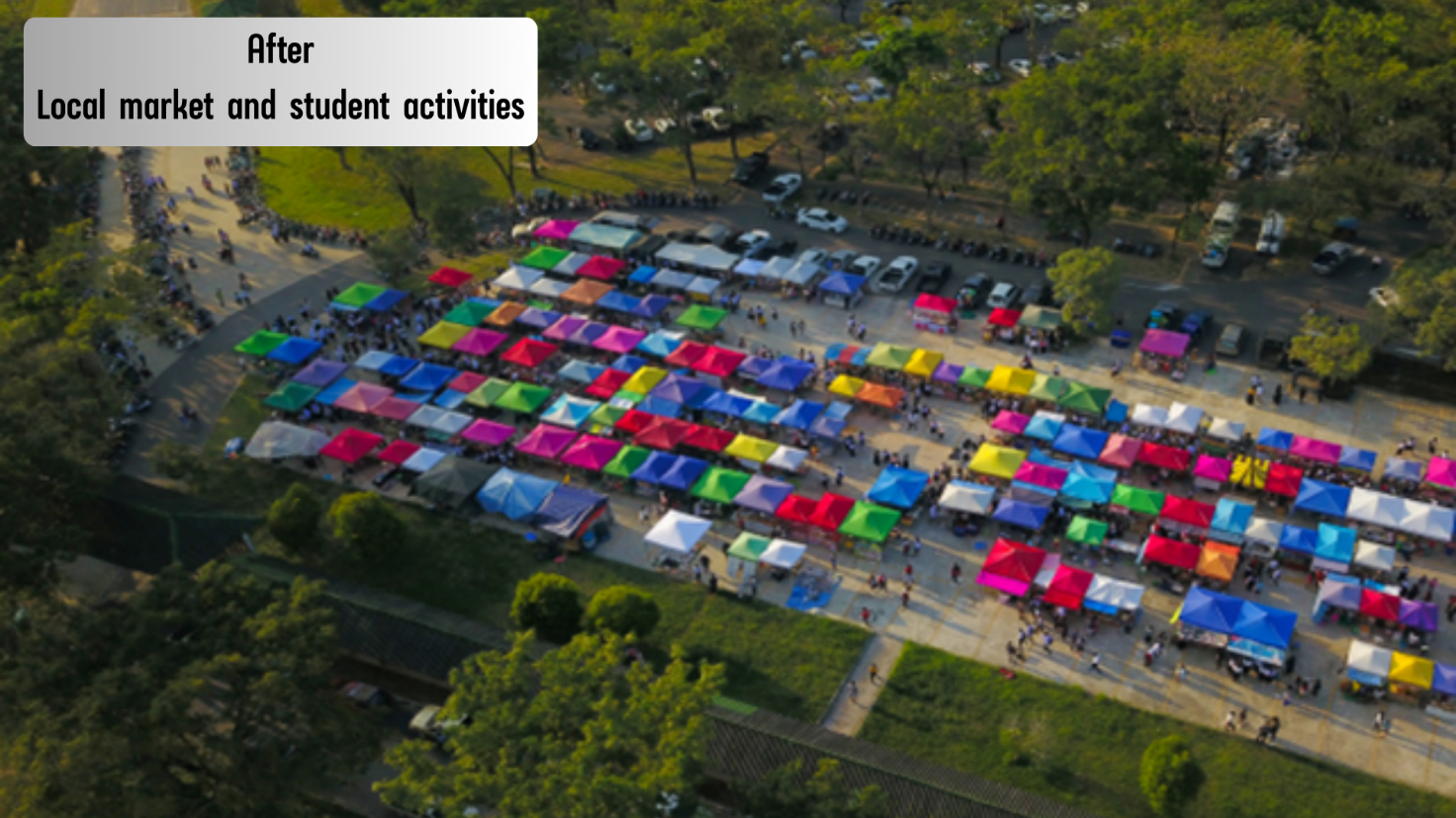 Furthermore, some parking spaces adjacent to academic buildings have been converted into weekly community markets, including the Chanpradoo Market (every Monday evening), BOTA Market (every Thursday), and Khlong Din Market (every Tuesday). These areas are also utilized for various university events such as the annual Graduation Ceremony and other co-curricular and extracurricular activities held regularly throughout the past three years.