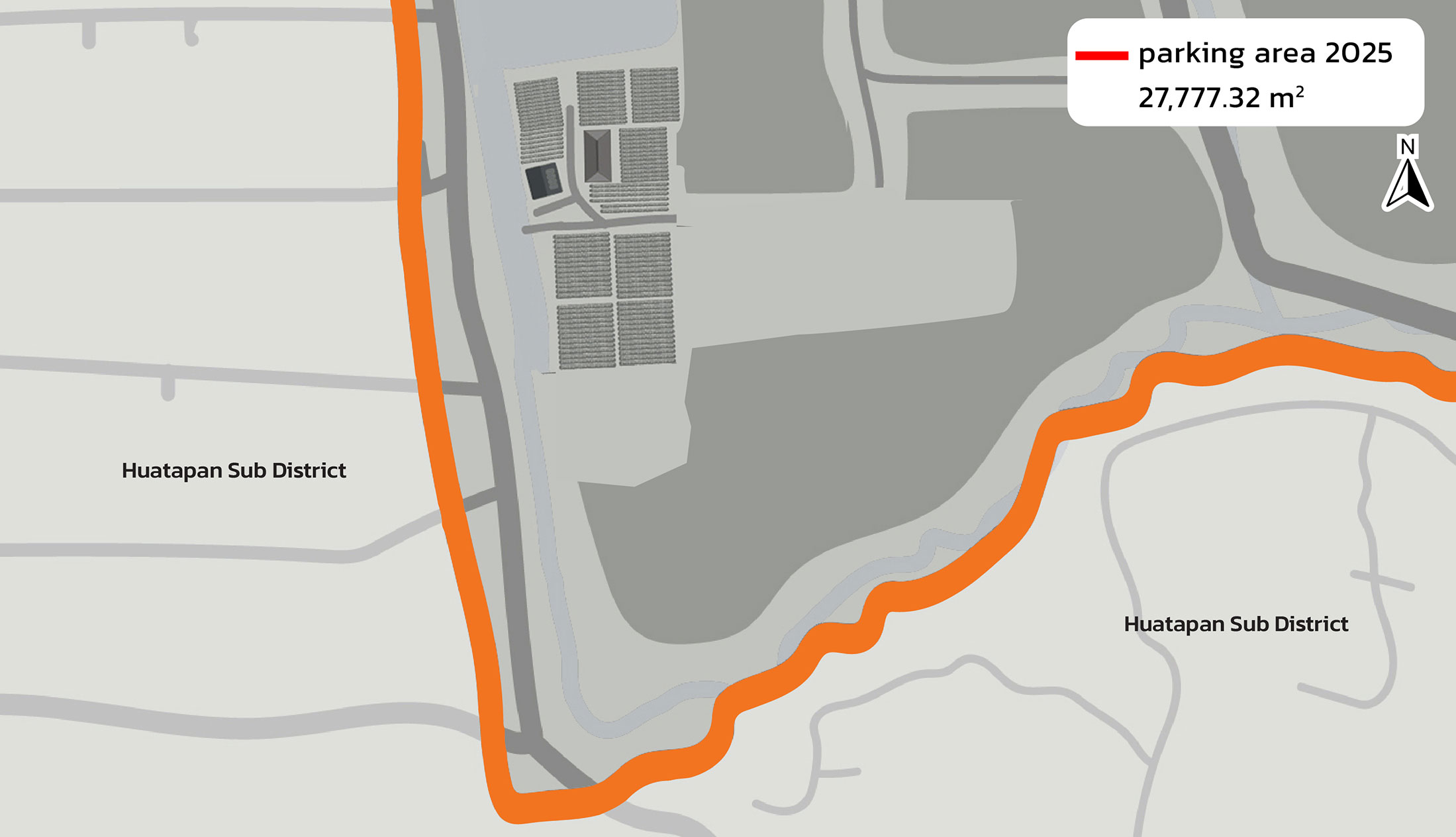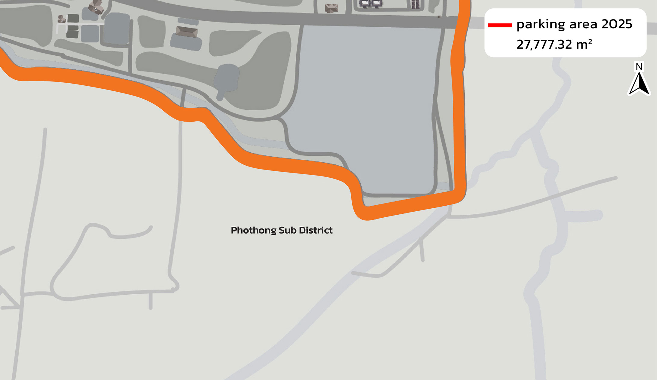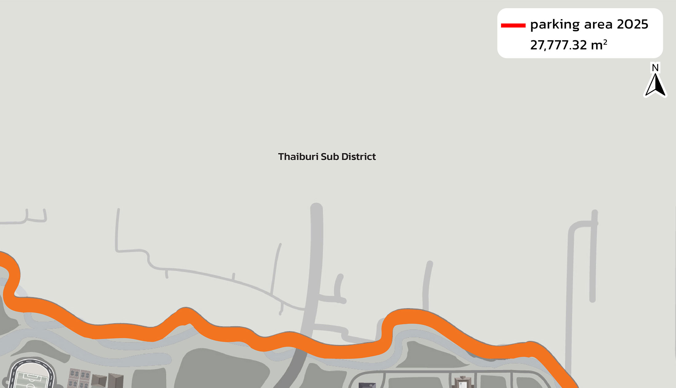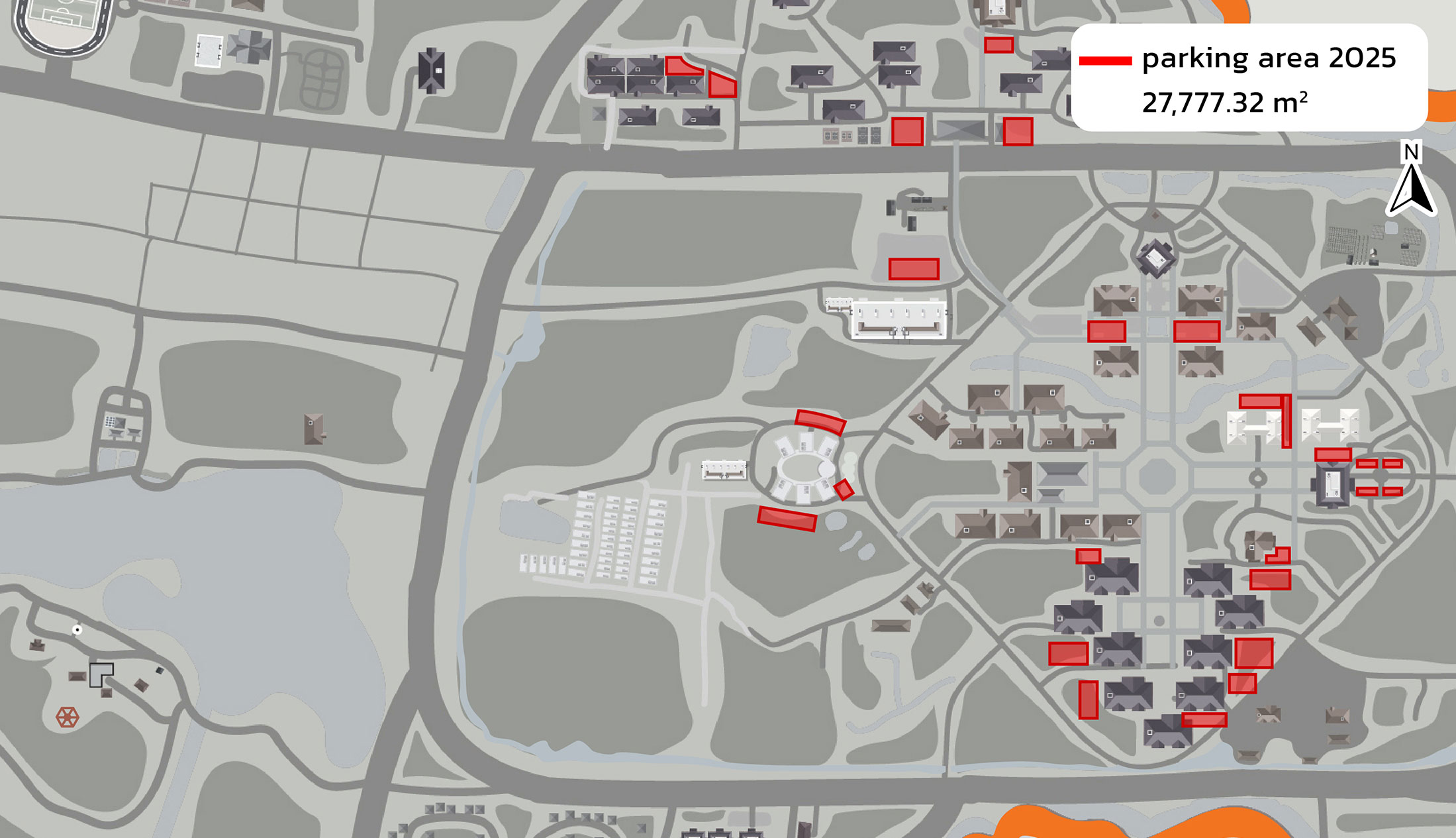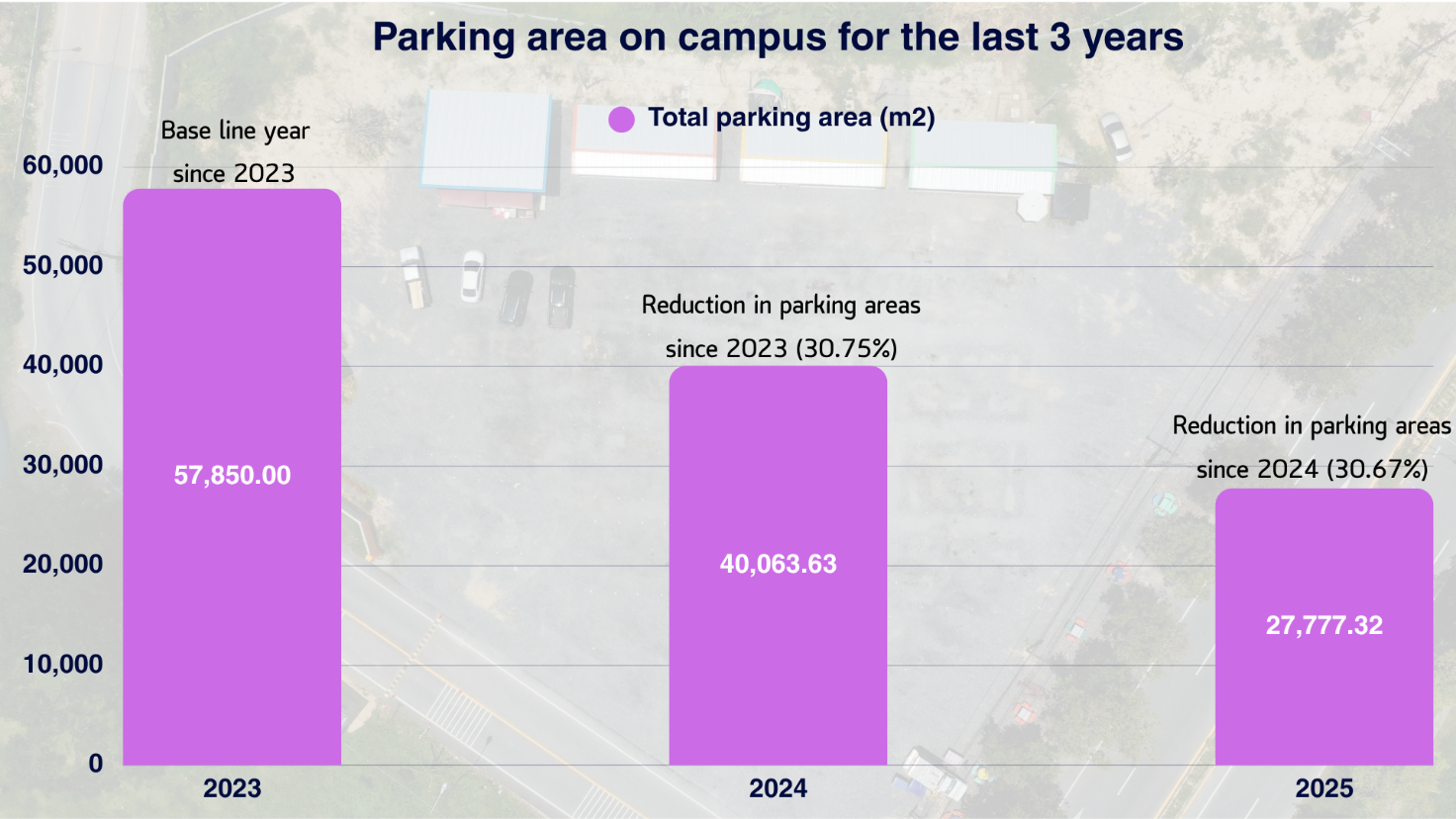 Over the past three years, Walailak University has focused on reducing the number of internal combustion engine vehicles on campus, alongside decreasing the overall parking space. Several parking areas have been repurposed into academic buildings and outdoor activity spaces. At the same time, the University has actively promoted the practice of parking only in designated areas among students, staff, and visitors. As a result, by 2025, the University successfully reduced parking space by 30.67% through the following measures: