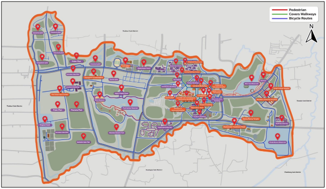 A map showing covered walkway routes, pedestrian paths, and bicycle routes