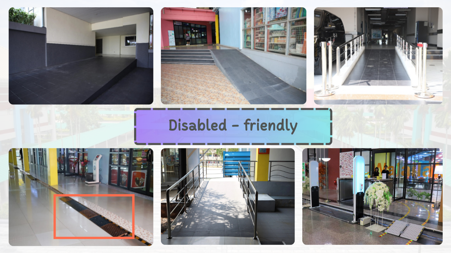 - Walkways are designed with ramps that accommodate individuals with disabilities and those with special mobility needs.