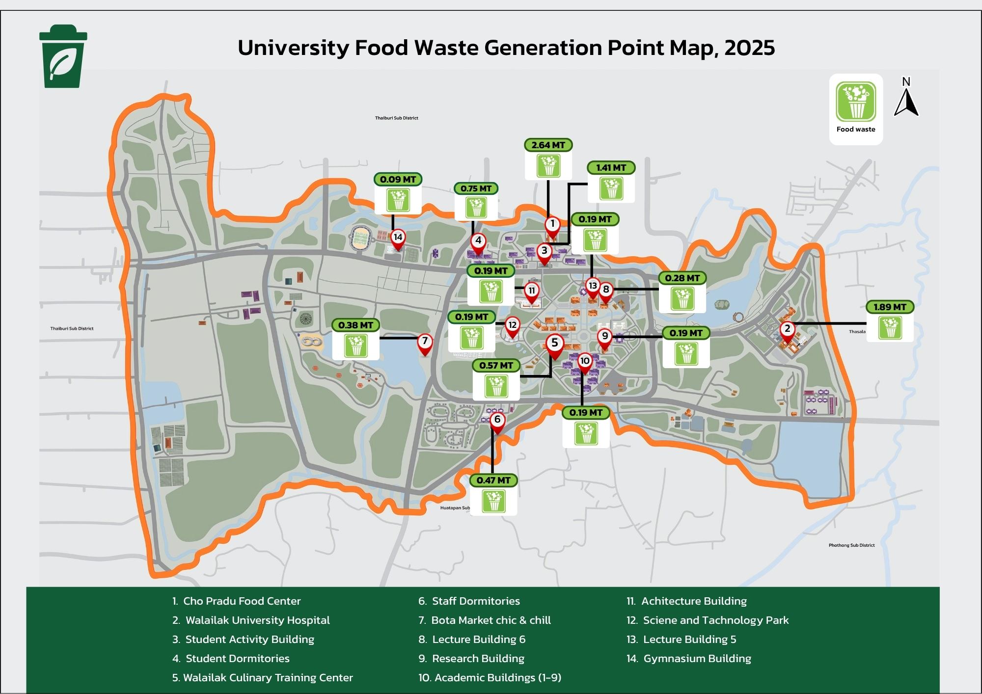 Walailak University generates approximately 9.43 tons of food waste annually, primarily from cafeterias and campus facilities. Food waste is separated at the source with the cooperation of vendors and staff using green bins. The collected food waste is transported to the university farm, where it is utilized as animal feed, thereby reducing landfill disposal and converting waste into useful resources.
