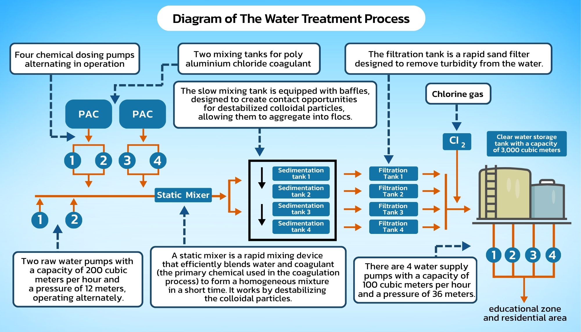 - Sedimentation Tanks (Solid Contact Clarifier, Pulsator Type) combine coagulation, flocculation, and sedimentation in one unit, with automatic sludge discharge every hour to avoid accumulation of pollutants.
