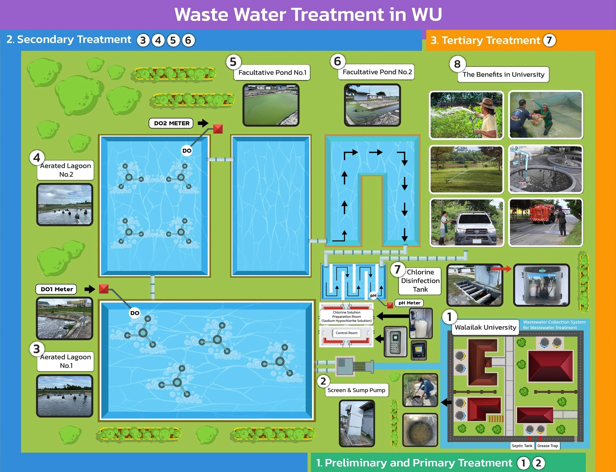 Walailak University operates an advanced wastewater treatment system that is capable of handling all wastewater generated on campus. The system applies tertiary treatment, consisting of the following stages