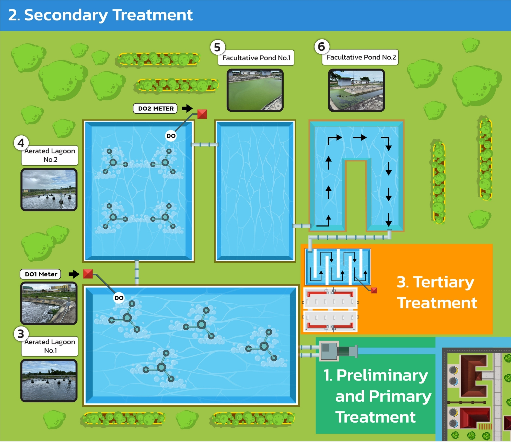 Figures: Tertiary Wastewater Treatment System covers preliminary, aerated lagoon, stabilization, and disinfection processes, complemented by real-time monitoring of DO, pH, and free chlorine.