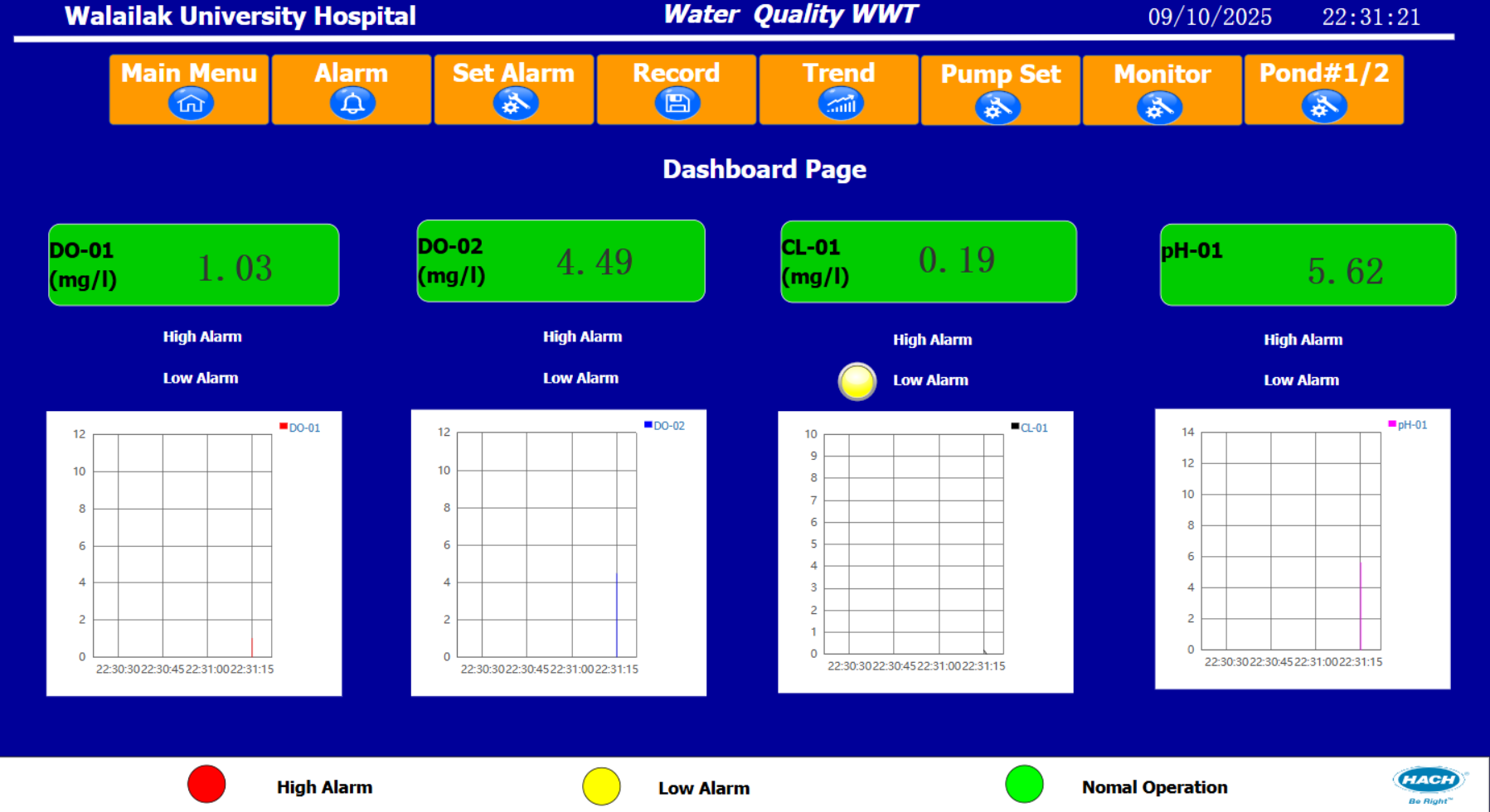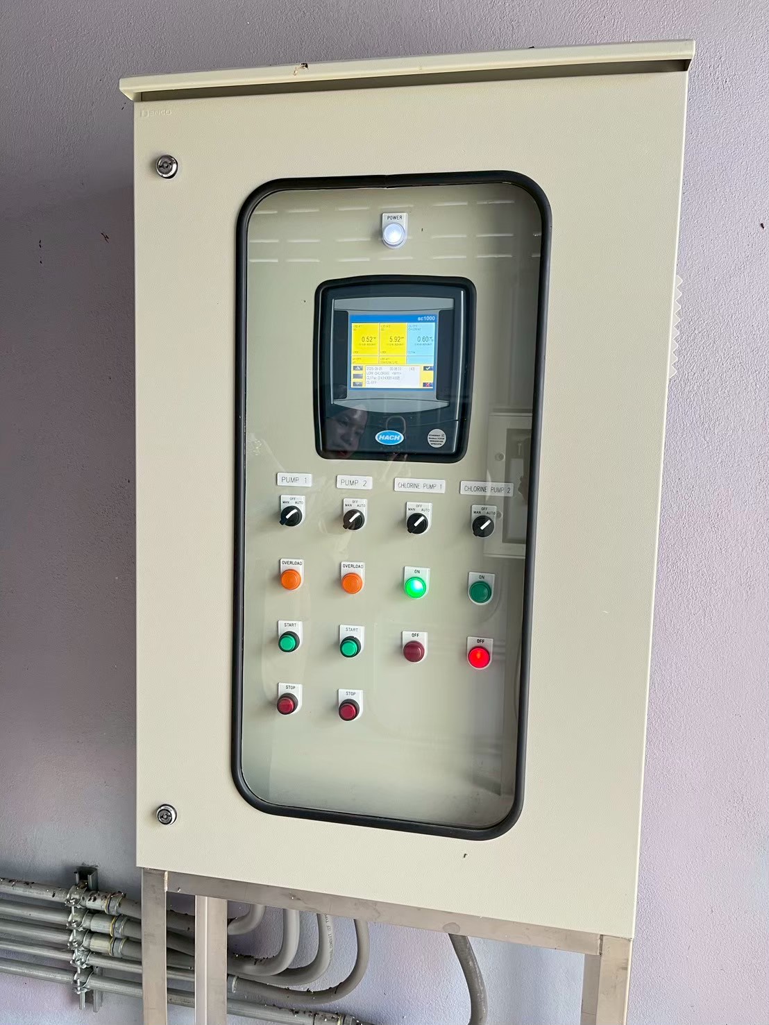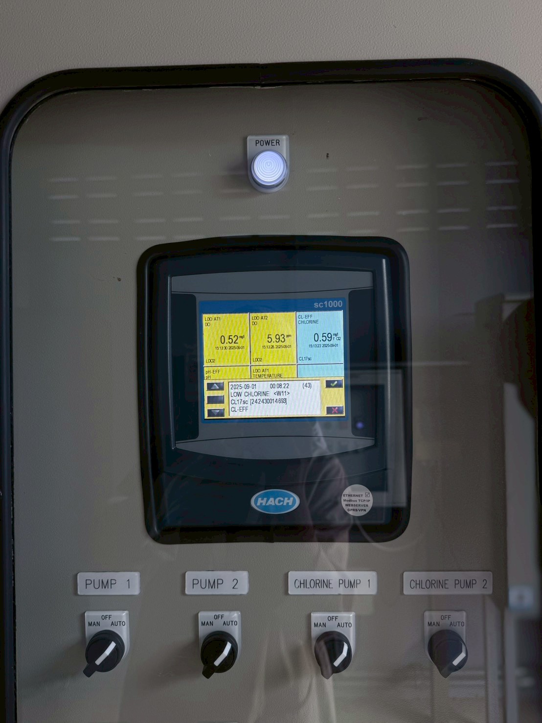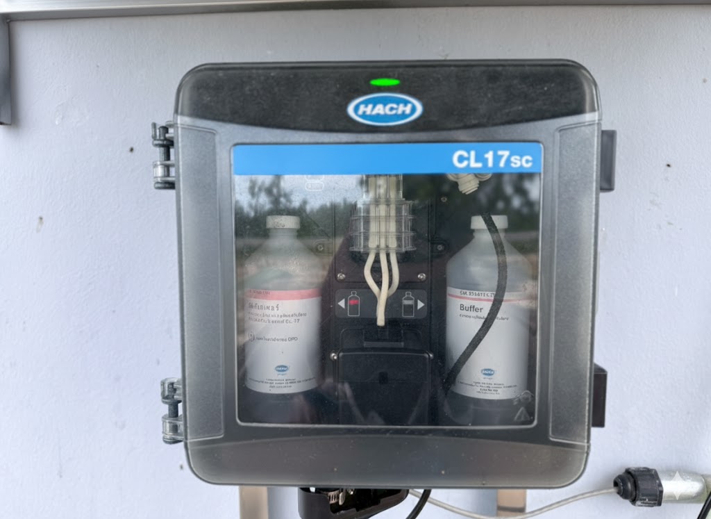 - The Chlorine Contact Tank is equipped with both pH probes and residual chlorine probes to monitor disinfection performance and water quality. Data from all sensors is transmitted to the PLC (WECON) and SC1000 Controller (HACH), which communicate with the central Cloud SCADA for data recording, trend analysis, and alarm notifications.