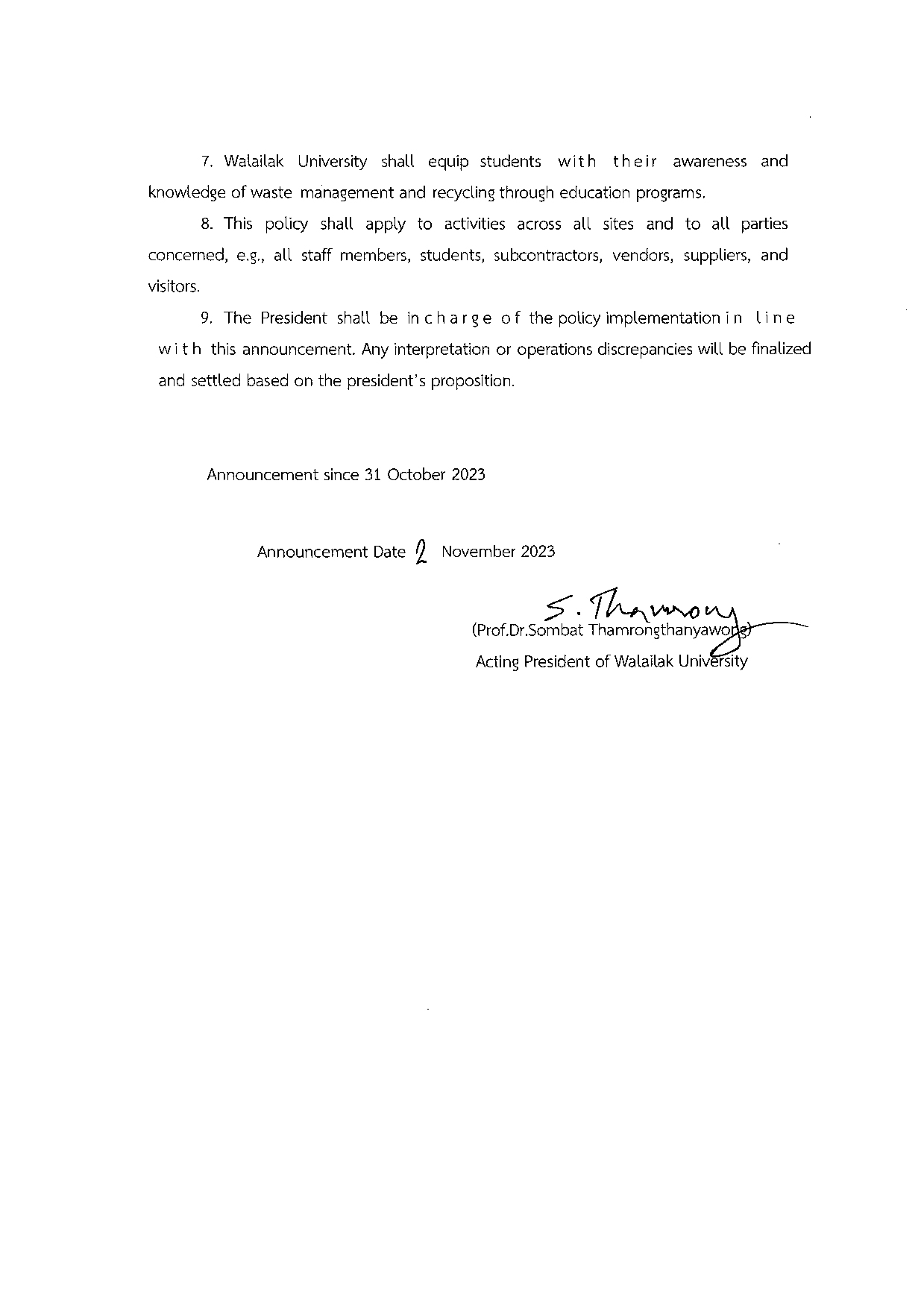Walailak University (WU) has always applied an integrated waste management approach in support of its Green University Initiative which goal is to attain zero waste management with economic, social, and environmental sustainability considerations in mind. At present, WU has policies, guidelines, and activities to measure the amount of waste generated across the university. The processes of existence of measurement at the whole university throughout its different stages are as follows: