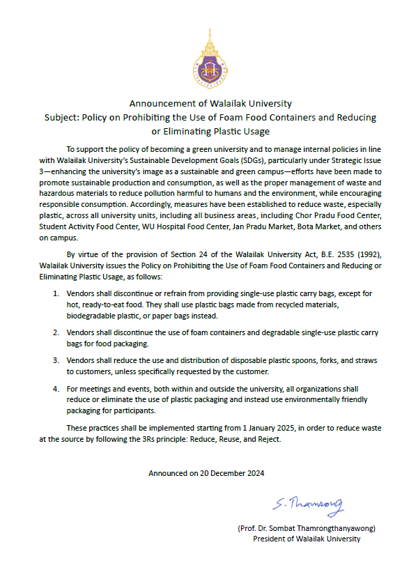 The university encourages staff and students to opt for online communication methods, such as virtual meetings and webinars, to reduce the need for air travel, thereby cutting down on associated greenhouse gas emissions. In 2025, during the University Council meetings, executives and committee members can choose to participate via Zoom Meeting instead of traveling to Bangkok for the meetings. In 2025, a total of 609 committee members attended the meetings via Zoom Meeting, resulting in a reduction of 69.79 tCO₂e/year in greenhouse gas emissions from air travel.