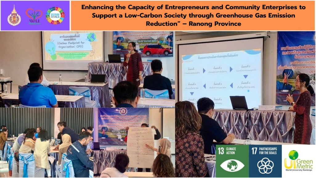 Walailak University, represented by Assoc. Prof. Dr. Laksanara Khwanchum, Deputy Director of the Academic Service Center, and Asst. Prof. Dr. Kamon Thinsurat, lecturer at the School of Engineering and Technology, served as speakers in the training workshop on “Enhancing the Capacity of Entrepreneurs and Community Enterprises to Support a Low-Carbon Society through Greenhouse Gas Reduction.” The event was organized by the Ranong Provincial Industry Office under the project “Preparing Enterprises for the Transition Toward Net Zero Emission Industry,” held on January 16–17, 2025, at Baan Yah Moo Hotel, Ranong Province.