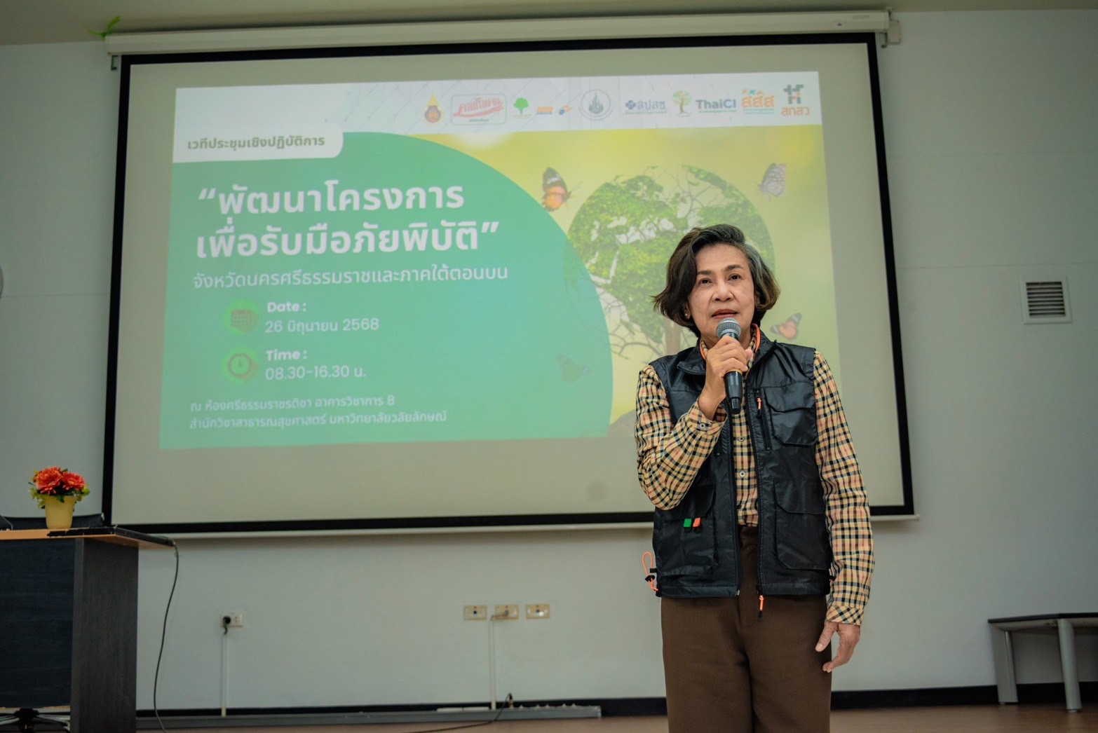 Asst. Prof. Dr. Supaporn Yimthieng, Dean of the School of Public Health, Walailak University, delivered the opening remarks at the “Workshop on Developing Projects for Disaster Preparedness in Nakhon Si Thammarat and Upper Southern Thailand.” The event brought together representatives from the public, private, academic, and local sectors to collaboratively develop integrated plans aimed at reducing disaster risks in the region.