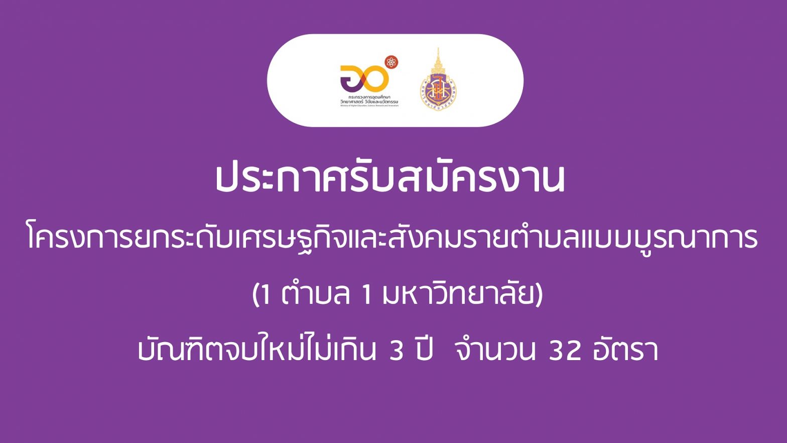 ประกาศรับสมัครงาน โครงการยกระดับเศรษฐกิจและสังคมรายตำบลแบบบูรณาการ (1 ตำบล 1 มหาวิทยาลัย) บัณฑิตจบใหม่ไม่เกิน 3 ปี (2561-2563) จำนวน 32 อัตรา