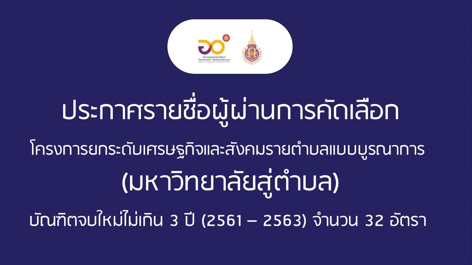 ประกาศรายชื่อผู้ผ่านการคัดเลือกโครงการยกระดับเศรษฐกิจและสังคมรายตำบลแบบบูรณาการ (1 ตำบล 1 มหาวิทยาลัย) ปฏิบัติงาน ณ ตำบลไทยบุรี ประเภท บัณฑิตจบใหม่ จำนวน 1 อัตรา